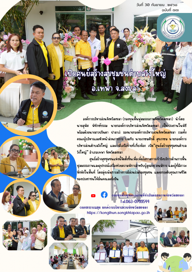 วันนี้ (30 ก.ย. 68) นายสุพิศ พิทักษ์ธรรม นายกองค์การบริหารส่วนจังหวัดสงขลา เป็นประธานในพิธีเปิดศูนย์สร้างสุขชุมชนตำบลวังใหญ่ พร้อมด้วย นางสาวปรินดา ปาลาเร่ รองนายกองค์การบริหารส่วนจังหวัดสงขลา นายธนิศร์ ทองสุข เลขานุการนายกองค์การบริหารส่วนจังหวัดสงขลา นายวรพงศ์ ปราบ สมาชิกสภาองค์การบริหารส่วนจังหวัดสงขลา อำเภอเทพา เขต 1 นายอภิชัย เกื้อก่อบุญ รองปลัดองค์การบริหารส่วนจังหวัดสงขลา รักษาราชการแทน ผู้อำนวยการกองสาธารณสุข องค์การบริหารส่วนจังหวัดสงขลา นางฐิตารีย์ เชื้อพราหมณ์ ผู้ช่วยเลขานุการคณะกรรมการกองทุนฟื้นฟูสมรรถภาพจังหวัดสงขลา เจ้าหน้าที่ อสม. และภาคีเครือข่าย เข้าร่วม โดยมี นายเกษมศักดิ์ สุขเกษม นายกองค์การบริหารส่วนตำบลวังใหญ่ กล่าวต้อนรับ นางรอกีเย้าะ ยูโซะ ผู้อำนวยการโรงพยาบาลส่งเสริมสุขภาพตำบลวังใหญ่ กล่าวรายงาน ณ ศูนย์สร้างสุขชุมชนตำบลวังใหญ่ อำเภอเทพา จังหวัดสงขลา