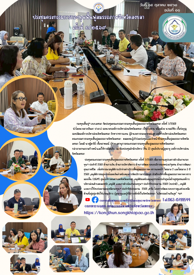 ประชุมคณะกรรมการกองทุนฟื้นฟูสมรรถภาพจังหวัดสงขลา ครั้งที่ 1/2569 เพื่อรายงานสรุปผลการดำเนินงานกองทุนฯ ประจำปี 2568 ด้านการเงิน ด้านการบริหารจัดการ ด้านการพัฒนาระบบบริการของหน่วย/ชุมชน ด้านการพัฒนาคุณภาพชีวิต เพิ่อพิจารณาอนุมัติการเบิกจ่ายค่าบริการฟื้นฟูสมรรถภาพทางการแพทย์ฯ ไตรมาส 2 และไตรมาส 3 ปี 2568 ,อนุมัติการขออุทธรณ์ยอดเงินค่าสนับสนุนการจัดบริการสาธารณสุข สำหรับบริการฟื้นฟูสมรรถภาพทาพทางการมองเห็น (O&M) ศูนย์บริการคนตาบอดจังหวัดสงขลา ,อนุมัติขอสนับสนุนอุปกรณ์ประจำศูนย์สร้างสุขชุมชนองค์การบริหารส่วนตำบลคลองหรัง ,อนุมัติขอรับการสนับสนุนงบประมาณสำหรับการดำเนินงานของศูนย์สร้างสุขชุมชน เทศบาลตำบลบางเหรียง ,ขอนุมัติ ร่าง ประกาศกองทุนฟื้นฟูสมรรถภาพจังหวัดสงขลา เรื่อง หลักเกณฑ์การดำเนินงานและบริหารจัดการศูนย์สร้างสุขชุมชน พ.ศ. 2564 (หมวด ๓ เพิ่มเติม) ,อนุมัติเปลี่ยนแปลงสัญญาจ้างพนักงานกองทุนฟื้นฟูฯ ตามระเบียบงานริหารงานบุคคล อบจ.สงขลาอนุมัติการจ้างเหมาบริการ พนักงาน ตำแหน่ง ผู้ช่วยนักวิชาการสาธารณสุข จำนวน 1 อัตรา และตำแหน่งเจ้าพนักงานบันทึกข้อมูลและสารสนเทศ จำนวน 1 อัตรา ,อนุมัติ แผนการดำเนินงานกองทุนฯ ประจำปีงบประมาณ 2569 (งบปกติ) ,อนุมัติ แผนการใช้งบประมาณคงเหลือกองทุนฯ ประจำปีงบประมาณ 2569 ,พิจารณาอนุมัติการขอรับงบสนับสนุนโครงการ จำนวน 2 โครงการ ,หารือ โครงการพัฒนาระบบการดูแลช่วยเหลือต้านที่อยู่อยู่อาศัยให้แก่คนพิการ ผู้สูงอายุและผู้ที่มีภาวะพึ่งพิ่งในจังหวัดส่งขลา "นวัตกรรมบ้านปันสุข" ,หารือ โครงการพัฒนาระบบบริการรถโดยสารสาธารณะสำหรับผู้ป่วยติดเตียงและผู้ป่วยที่มีความยากลำบากในการไปรับบริการสาธารณสุขด้วยตนเอง เพื่อการเข้าถึงบริการฟื้นฟูสมรรถภาพในจังหวัดสงขลา “รถเติมสุข” ,หารือ การจ้างงานคนพิการของสถานประกอบการประจำศูนย์ซ่อมสร้างสุขชุมชน