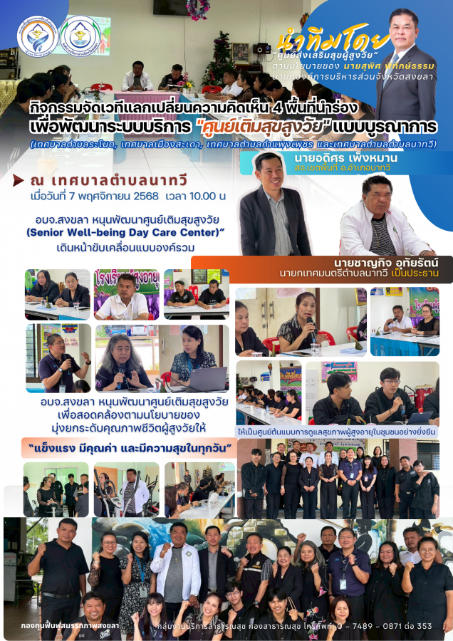 ร่วมกิจกรรมจัดเวทีแลกเปลี่ยนความคิดเห็น 4 พื้นที่นำร่องเพื่อพัฒนาระบบบริการ "ศูนย์เติมสุขสูงวัย" แบบบูรณาการ (เทศบาลตำบลระโนด, เทศบาลเมืองสะเดา, เทศบาลตำบลกำแพงเพชร และเทศบาลตำบลตำบลนาทวี) อบจ.สงขลา หนุนพัฒนาศูนย์เติมสุขสูงวัย (Senior Well-being Day Care Center)” เดินหน้าขับเคลื่อนแบบองค์รวม ณ เทศบาลตำบลนาทวี