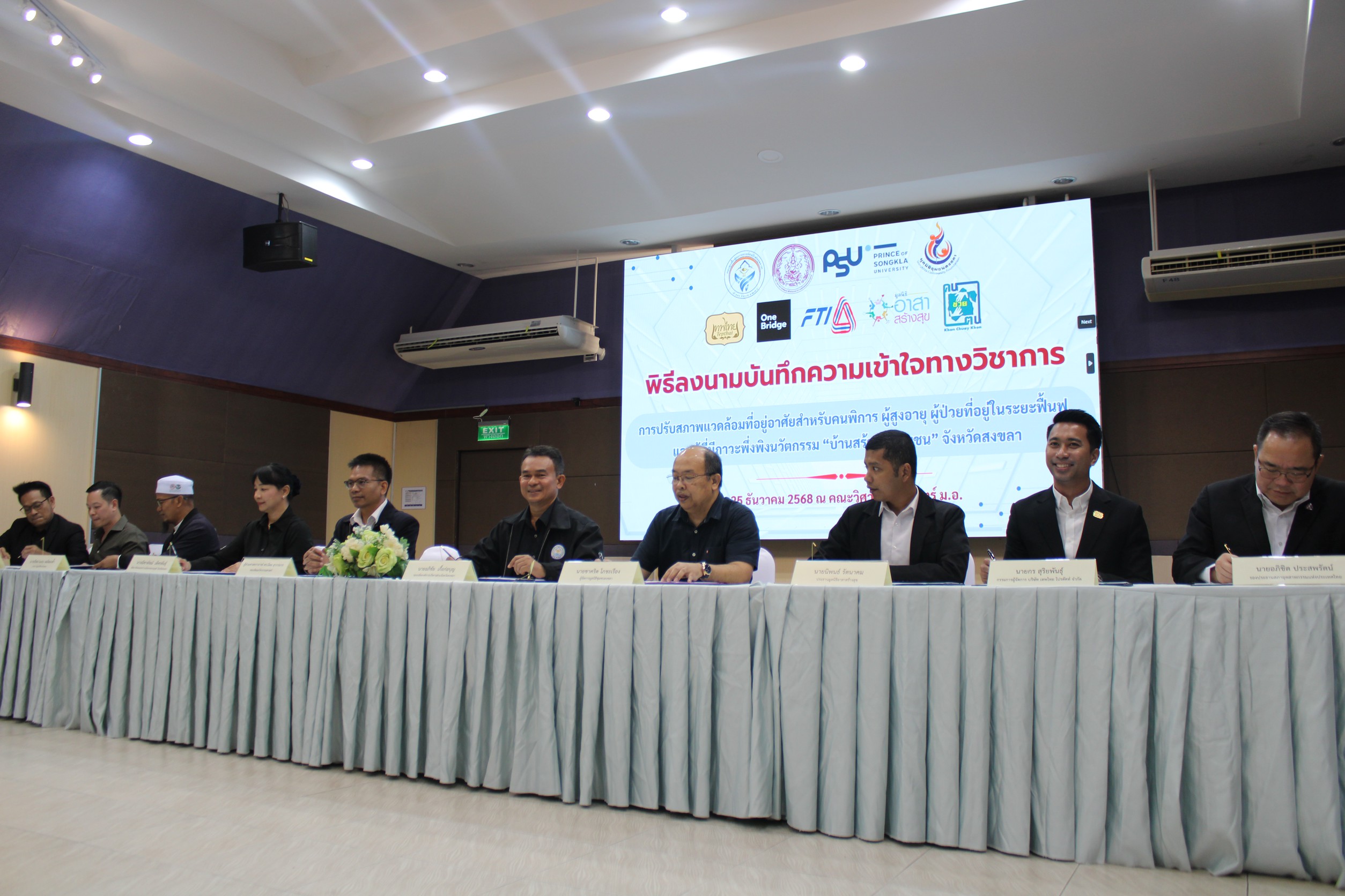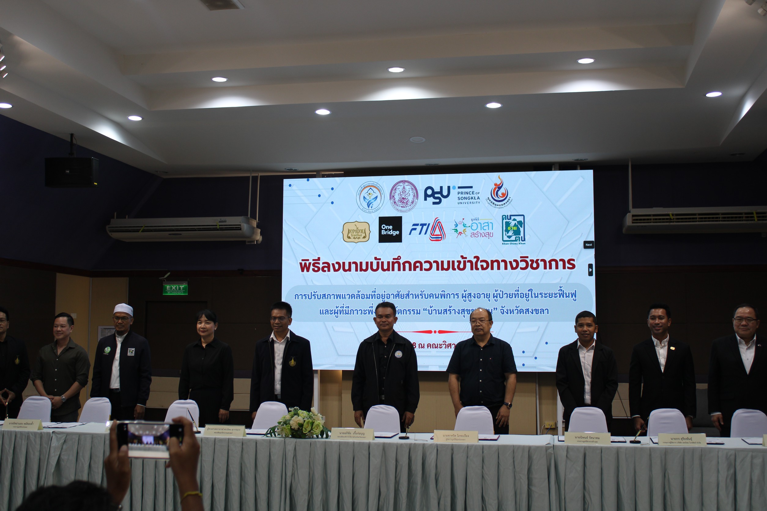 จึงเป็นที่มาของความร่วมมือครั้งประวัติศาสตร์ในวันนี้ ที่เราได้รวบรวมภาคีเครือข่ายสำคัญ ๙ หน่วยงาน โดยเฉพาะการผนึกกำลังกับภาควิชาการอย่างคณะวิศวกรรมศาสตร์ มหาวิทยาลัยสงขลานครินทร์ และภาคอุตสาหกรรม เพื่อนำ “นวัตกรรม” เข้ามาผสมผสาน ทั้งหลักการ Universal Design และโครงสร้างที่พร้อมรับมือภัยพิบัติ (Disaster Resilience) เพื่อให้บ้านทุกหลังที่เราสร้าง ไม่ได้เป็นเพียงที่อยู่อาศัย แต่เป็น “นวัตกรรมบ้านสร้างสุข” ที่มั่นคง ยั่งยืน และเปลี่ยนชีวิตคนสงขลาได้อย่างแท้จริง “สร้างสุขในถิ่นที่อยู่เดิม”