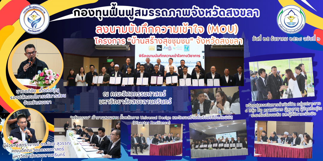 วันที่ ๒๕ ธันวาคม พิธีลงนามบันทึกความเข้าใจ (MOU) เพื่อขับเคลื่อนนวัตกรรม "บ้านสร้างสุขชุมชน" ซึ่งถือเป็นการยกระดับคุณภาพชีวิตพี่น้องชาวสงขลาในวันนี้ โครงการ “บ้านสร้างสุขชุมชน” ภายใต้การบริหารจัดการของกองทุนฟื้นฟูสมรรถภาพจังหวัดสงขลา องค์การบริหารส่วนจังหวัดสงขลา ซึ่งเป็นการสมทบงบประมาณร่วมกันระหว่าง อบจ.สงขลา ร่วมกับ สำนักงานหลักประกันสุขภาพแห่งชาติ ตั้งแต่ปี ๒๕๕๘ เป็นต้นมา แต่กองทุนฯไม่ได้เริ่มต้นจากเพียงแค่ภารกิจตามระเบียบราชการ แต่เริ่มจาก “ความมุ่งมั่นตั้งใจ” ที่จะขจัดอุปสรรคในการดำเนินชีวิตของกลุ่มเปราะบาง ๔ กลุ่มหลัก คือ คนพิการ ผู้สูงอายุ ผู้ป่วยที่อยู่ในระยะกึ่งเฉียบพลัน และผู้ที่มีภาวะพึ่งพิง เพื่อให้พวกเขาสามารถดำรงชีวิตในถิ่นที่อยู่เดิมได้อย่างมีศักดิ์ศรี ปลอดภัย และมีความสุข