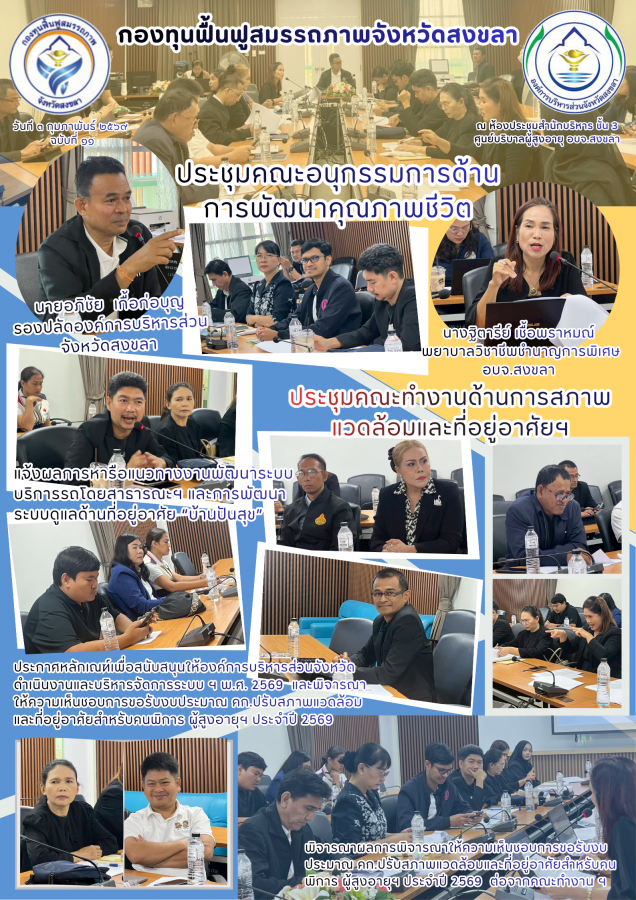วันที่ 3 กุมภาพันธ์ 2569 กองทุนฟื้นฟูสมรรถภาพจังหวัดสงขลา จัดการประชุมคณะทำงานด้านการปรับสภาพแวดล้อมและที่อยู่อาศัยฯ และคณะอนุกรรมการด้านการพัฒนาคุณภาพชีวิต โดยนายอภิชัย เกื้อก่อบุญ รองปลัดองค์การบริหารส่วนจังหวัดสงขลา เป็นประธาน พร้อมคณะกรรมการภาคีเครือข่าย