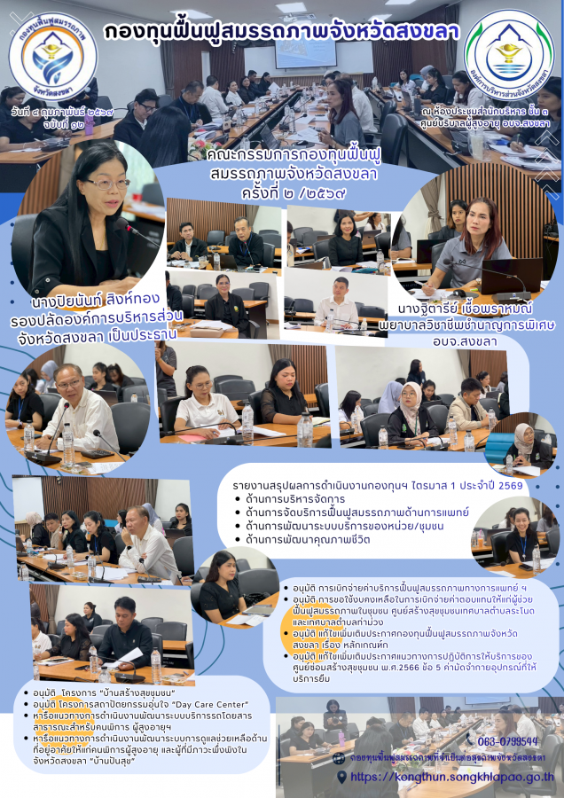 กองทุนฟื้นฟูฯ อบจ.สงขลา จัดประชุมคณะกรรมการกองทุนฟื้นฟูสมรรถภาพจังหวัดสงขลา ครั้งที่ 2/2569 นำโดยนางปิยนันท์ สิงห์ทอง รองปลัดองค์การบริหารส่วนจังหวัดสงขลา เป็นประธาน พร้อมด้วยคณะกรรมการกองทุนฟื้นฟูสมรรถภาพจังหวัดสงขลา ตลอดจนผู้เข้าร่วมประชุมและเจ้าหน้าที่กองทุนฟื้นฟูสมรรถภาพจังหวัดสงขลาเข้าร่วม โดยมี นางฐิตารีย์ เชื้อพราหมณ์ ผู้ช่วยเลขานุการคณะกรรมการกองทุนฟื้นฟูสมรรถภาพจังหวัดสงขลา กล่าวรายงานความก้าวหน้าและให้การต้อนรับ ณ ห้องประชุมสำนักบริหาร (ชั้น 3) ศูนย์บริบาลผู้สูงอายุ องค์การบริหารส่วนจังหวัดสงขลา