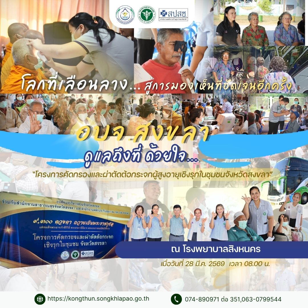 เมื่อวันที่ 28 มีนาคม 2569 เวลา 08.00 น. อบจ.สงขลา ลงพื้นที่ รพ.สิงหนคร คัดกรองต้อกระจกกว่า 350 ดวงตา เดินหน้าคืนแสงสว่างผู้สูงอายุองค์การบริหารส่วนจังหวัดสงขลา (อบจ.สงขลา) ลงพื้นที่ให้บริการตรวจคัดกรองผู้ป่วยโรคต้อกระจก ณ โรงพยาบาลสิงหนคร อำเภอสิงหนคร จังหวัดสงขลา โดยมีกลุ่มเป้าหมายเข้ารับการคัดกรองกว่า 350 ดวงตา เพื่อค้นหาผู้ป่วยและเข้าสู่กระบวนการรักษาอย่างเหมาะสม