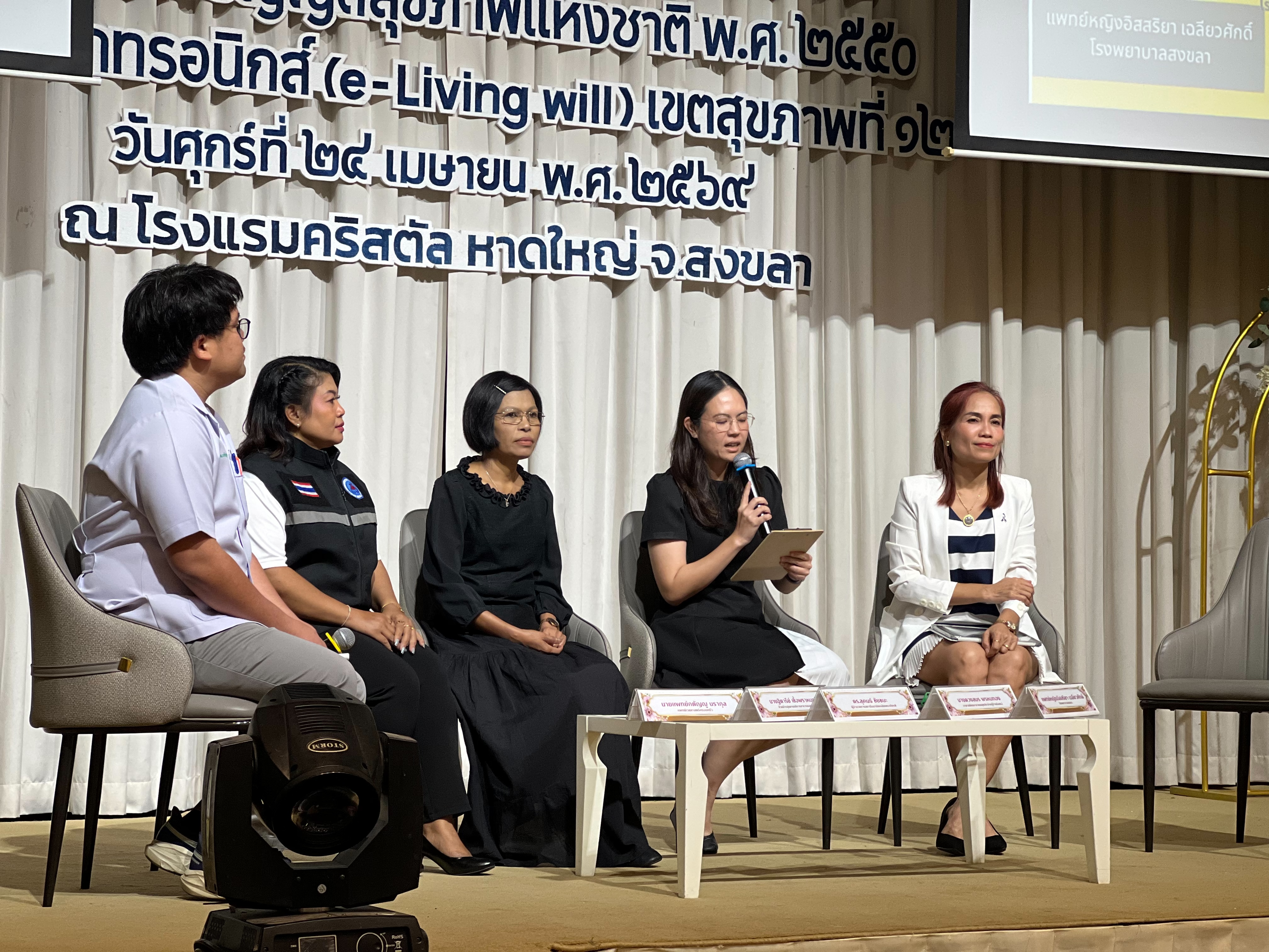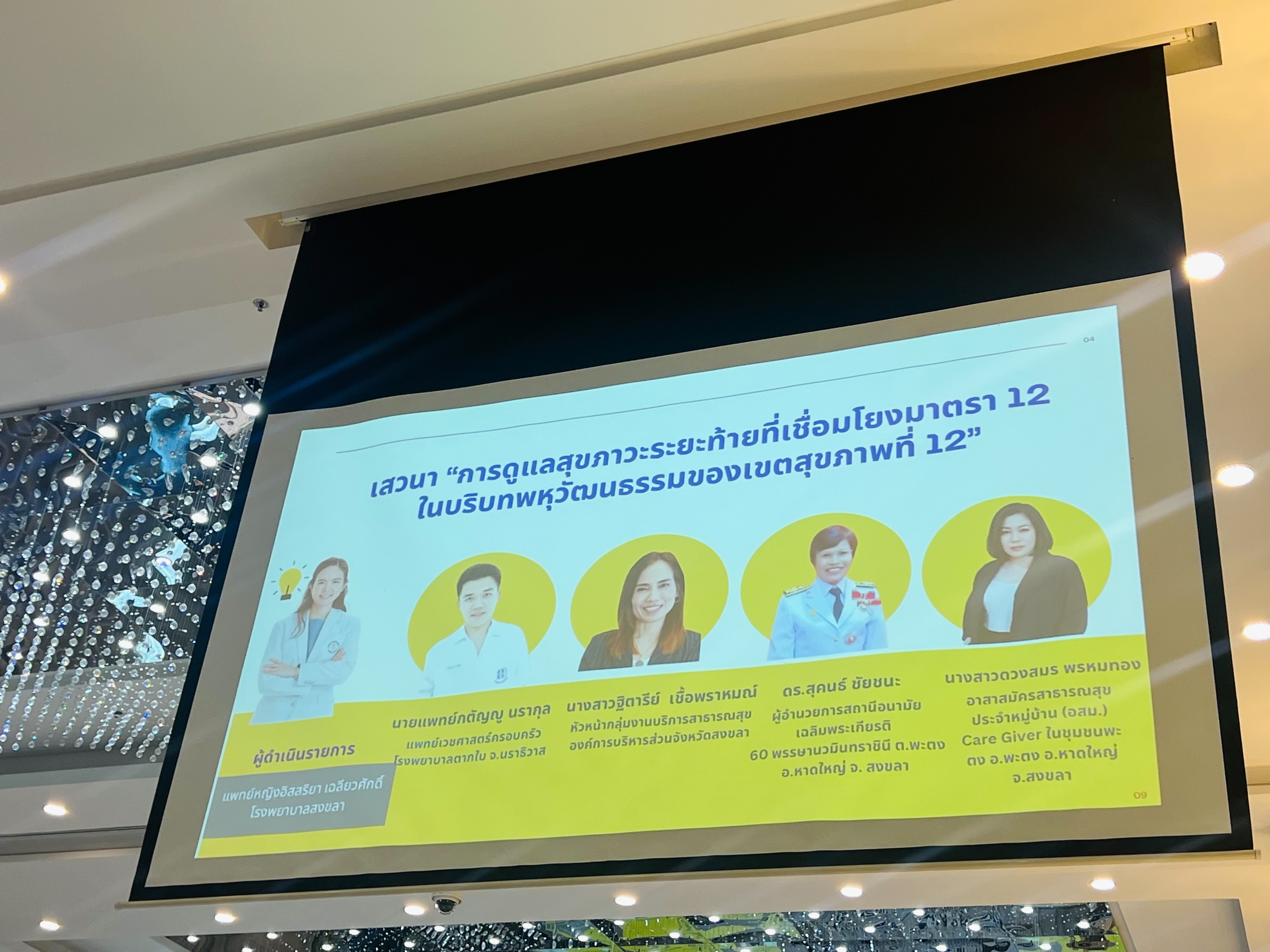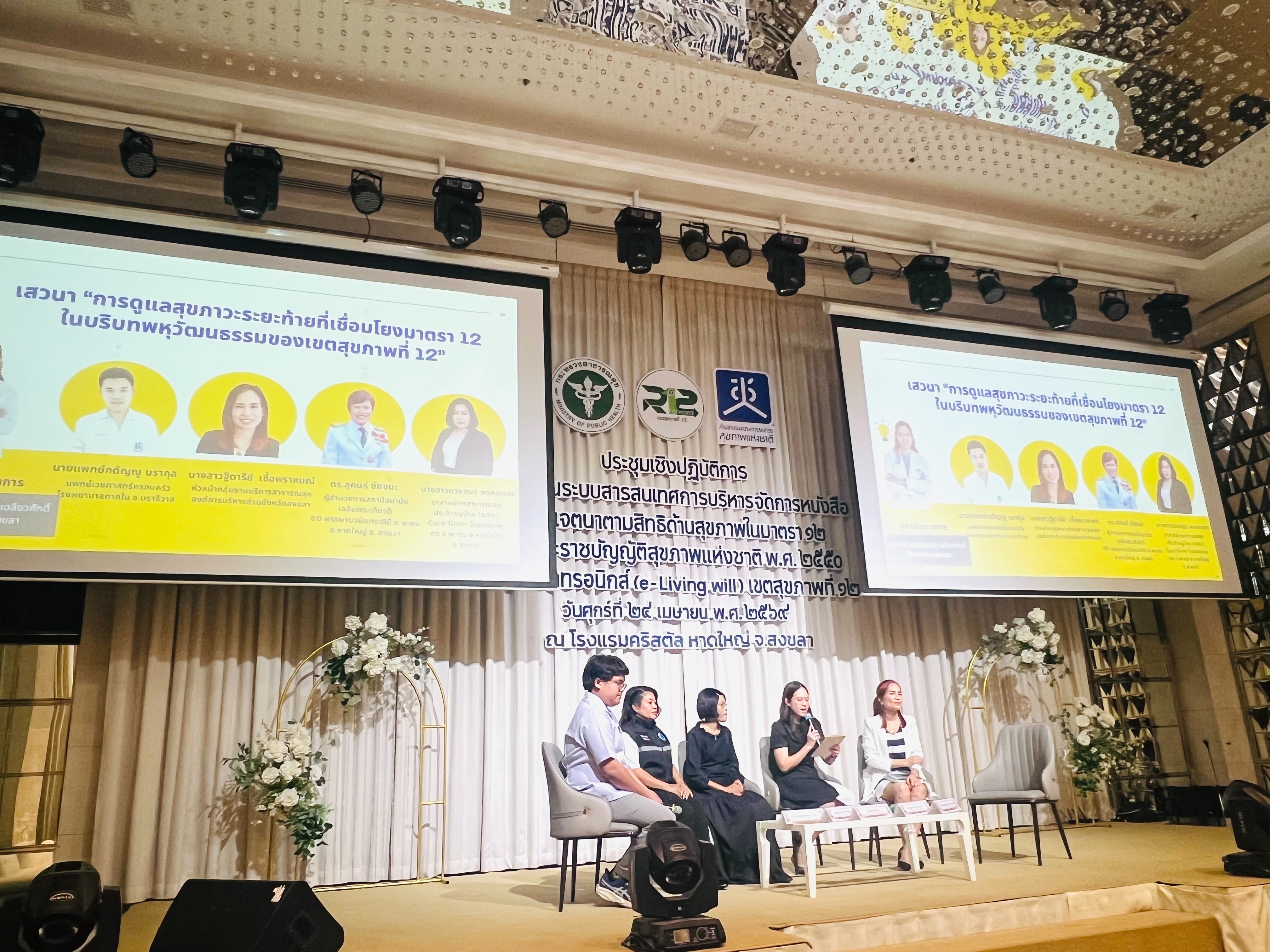 วันที่ 22 เมษายน 2569 กองทุนหลักประกันสุขภาพจังหวัดสงขลา นำโดย นางฐิตารีย์ เชื้อพราหมณ์ หัวหน้ากลุ่มงานบริการสาธารณสุข ร่วมเป็นวิทยากร "การดูแลสุขภาวะระยะท้ายที่เชื่อมโยง มาตรา 12 ในบริบท พหุวัฒนธรรมของเขตสุขภาพ ที่ 12 เพราะการดูแลกันจนถึง "วาระสุดท้าย" คือหัวใจของเรา อบจ.สงขลา พร้อมหนุนเสริมเครือข่ายสุขภาพเพื่อรอยยิ้มของคนในชุมชน ณ โรงแรมคริสตัส หาดใหญ่